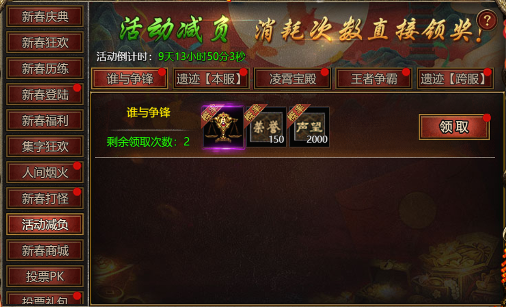 【活动内容】:活动期间,可消耗对应玩法次数直接领取奖励!
