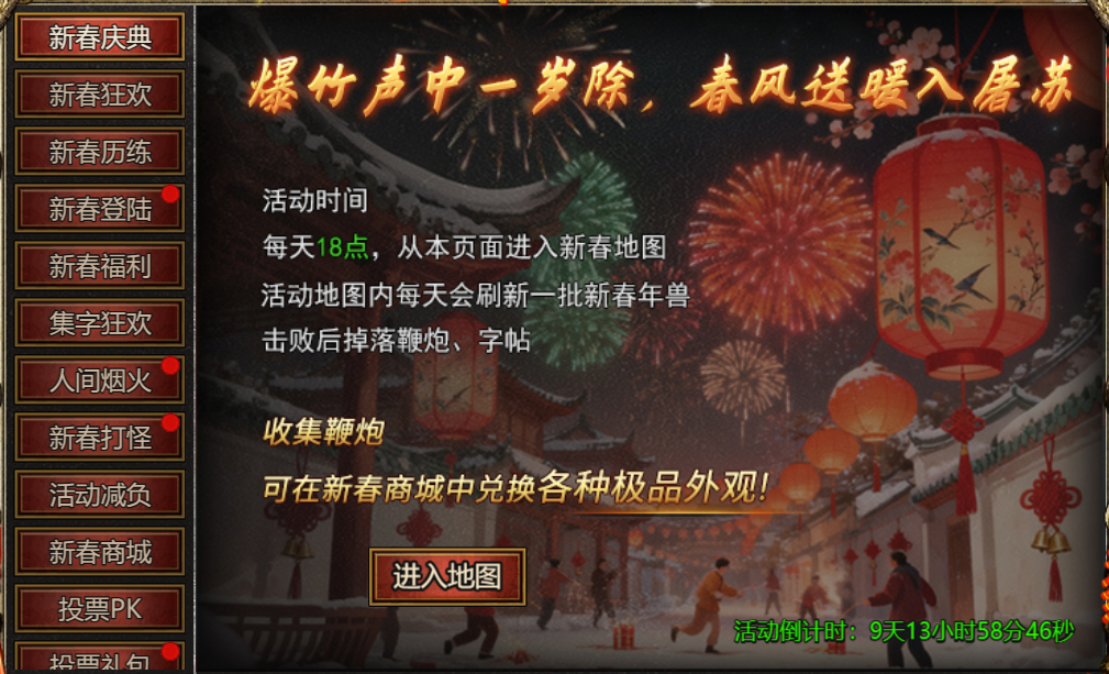 【活动内容】:每天18点可进入新春地图,打新春年兽,掉鞭炮,换极品外观!