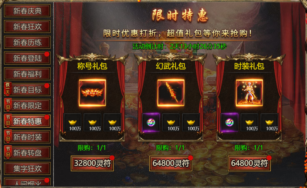 【活动内容】:活动期间,可使用灵符购买限定新春称号、幻武、时装礼包!
