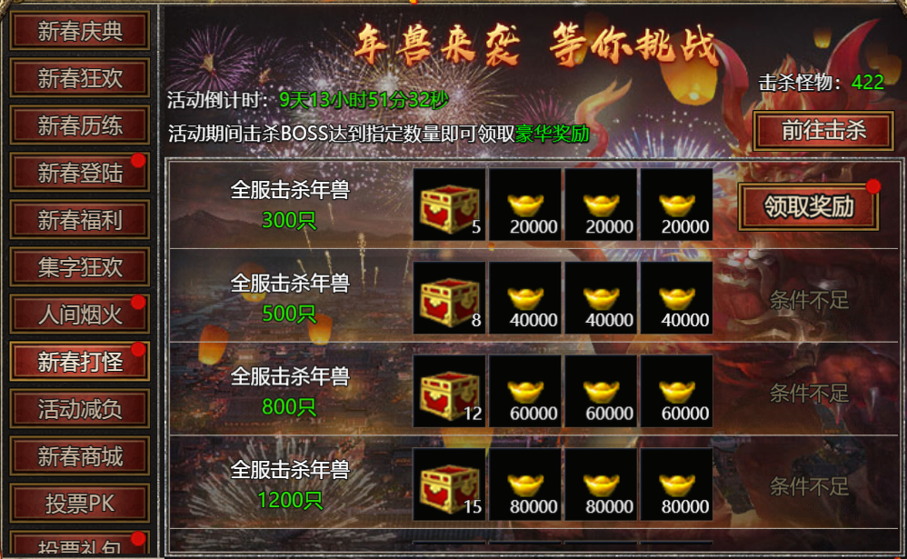 【活动内容】:活动期间,全服击杀指定年兽数量可领取豪华奖励!