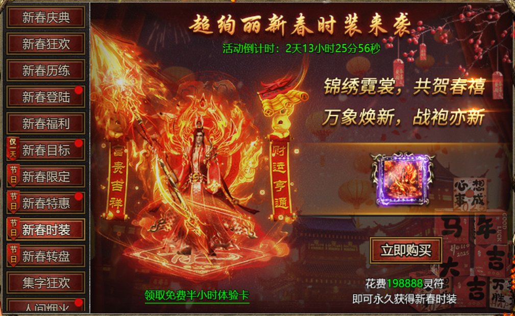【活动内容】:活动期间,超绚丽新春时装来袭,使用灵符可购买永久新春时装!